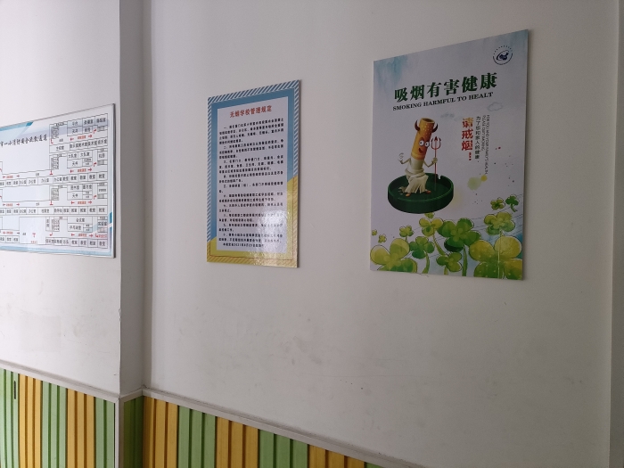 为更好的教育师生远离烟草,在校门口及走廊都张贴“禁止吸烟”的警示标识,时刻警醒师生吸烟有害健康。利用校园红领巾广播站宣传“拒绝吸烟,倡导文明生活”,让学生们知晓吸烟给我们带来的危害,小手拉大手,监督身边的大人不吸烟、少吸烟,为孩子们营造一个优良清新的社会环境。(作者:孟玲珑 摄影:王婷婷)