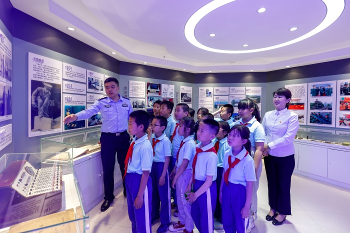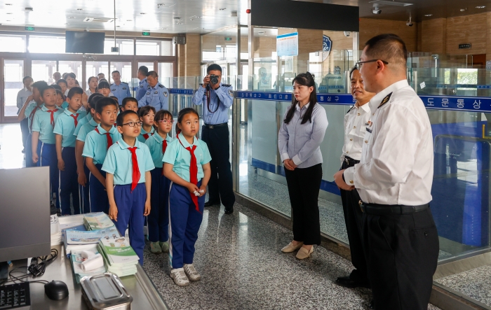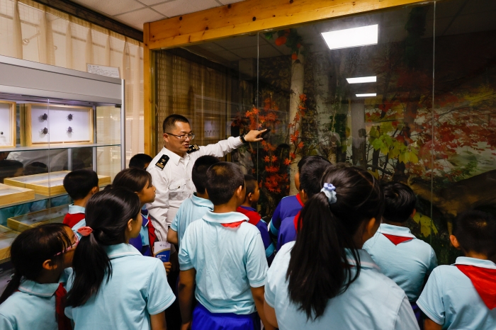 图们是一座边境小城,与朝鲜隔江相望,图们口岸则是连通朝鲜的国家大门,也是国际通商口,是对外往来的通道。孩子们在老师的带领下,兴致勃勃地来到图们口岸。图们边检站及图们海关工作人员引导孩子们由联建楼内进入图们公路桥,沿途介绍联检部门通关流程,讲述图们公路桥历史,让孩子们了解了边防战士卫国戍边、忠诚奉献的大无畏精神。接着,孩子们参观了口岸标本室,通关生动鲜活的标本实例,让孩子们了解了国门生物安全知识,近距离了解海关职能,进一步了解了生物入侵对我国生态环境的危害,懂得共同筑牢国门生物安全的重要性。随后,孩子们又参观图们边检站站史馆、图们海关关史室和联检部门史料馆,了解了党的奋斗历程。最后,图们边检站的叔叔们还为孩子们捐赠了图书。