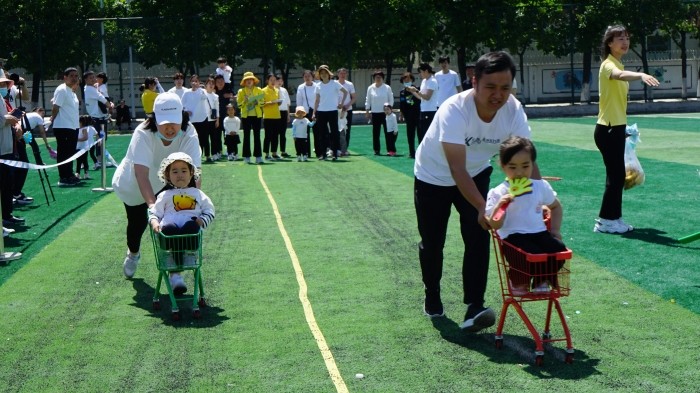 在运动场上,幼儿身穿统一服装,排着整齐的队伍,精神抖擞地步入操场,一个个团结友爱奋发向上的集体,充满着无限能量。检阅方队结束后,首先由园长讲话、幼儿代表发言、体操表演和幼儿最期待的游戏环节。伴随着阵阵口哨声,游戏比赛在教师们的组织下,井然有序地开展着,托班组的脚背走、障碍物,小班组的小蛇脱皮、你抛我接,中班组的袋鼠魔尺、蒙眼喂香蕉,大班组的螃蟹套圈、斯彩条等二十余种形式多样的比赛项目,不但为幼儿与家长之间创造了良好的沟通、交流的平台,还让幼儿和家长在趣味的游戏活动中,体验到了合作和体育竞技活动的独特魅力。