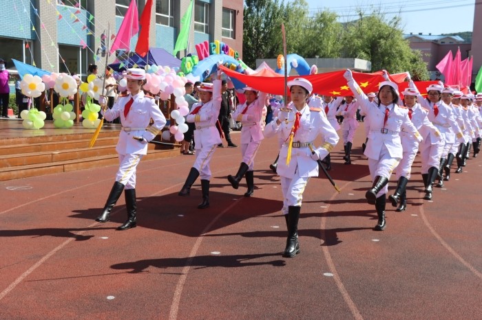 在激昂的《运动会进行曲》中, 国旗护卫队、彩旗队、年级方队依次入场,同学们精神抖擞,迈着整齐的步伐,喊着响亮的口号缓缓经过主席台,接受校领导的检阅。低年级学生还表演了舞蹈,充分展现了极具特色的班级文化和良好的精神风貌,为本次运动会增添一抹靓丽的色彩。