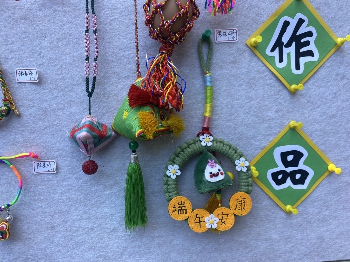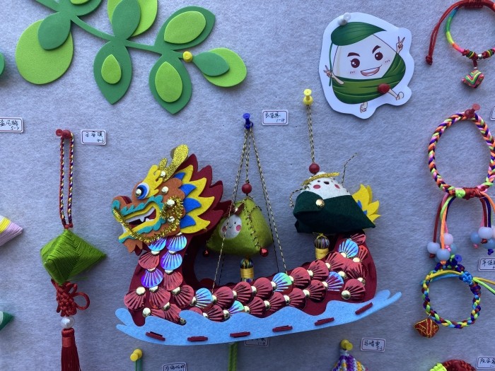 赛前,劳动老师在课堂上悉心教授了五彩绳的编织方法,孩子们认真观看、仔细倾听、动手实践,还不时与老师交流互动,快速掌握着编织要领。回家后,学生们尽情发挥想象,与父母一同编织出精美的作品,其中不仅有漂亮的五彩绳,还有小粽子、龙舟、钥匙环等,他们将满心的希望和期盼全化在了这细细的绳结上,同时也预示着每一年都会平安健康。学校挑选了优秀的作品进行了集中展示,学校的编织社团也借此机会展示出了一批精美的编制作品。