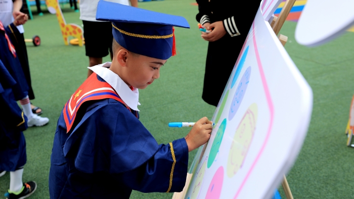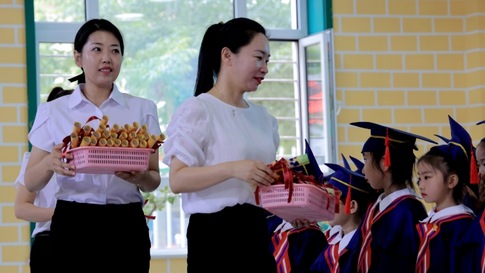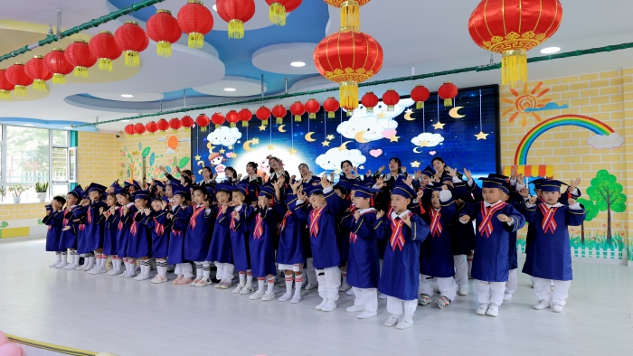 迎着朝阳,幼儿和家长踏着欢快的步伐走过成长之门,毕业典礼就此拉开帷幕。大班幼儿在留念墙前留下属于自己独一无二的笑脸和签名;小、中班幼儿将手中的祝福卡粘贴到“心语心愿”展板上,渲染了毕业季的氛围。园长、家长和幼儿代表寄予深切的祝福并表达了感谢之情。大班组幼儿齐声唱响《毕业歌》,舞蹈《阳光宝贝儿我最棒》《泱泱中华 百花齐放》等精彩节目迎来了阵阵掌声,浓浓的亲情、师生情在毕业典礼中涌动。最后,幼儿园领导为大班幼儿颁发了人生中第一个毕业证书,为本次毕业典礼画上了圆满的句号。
