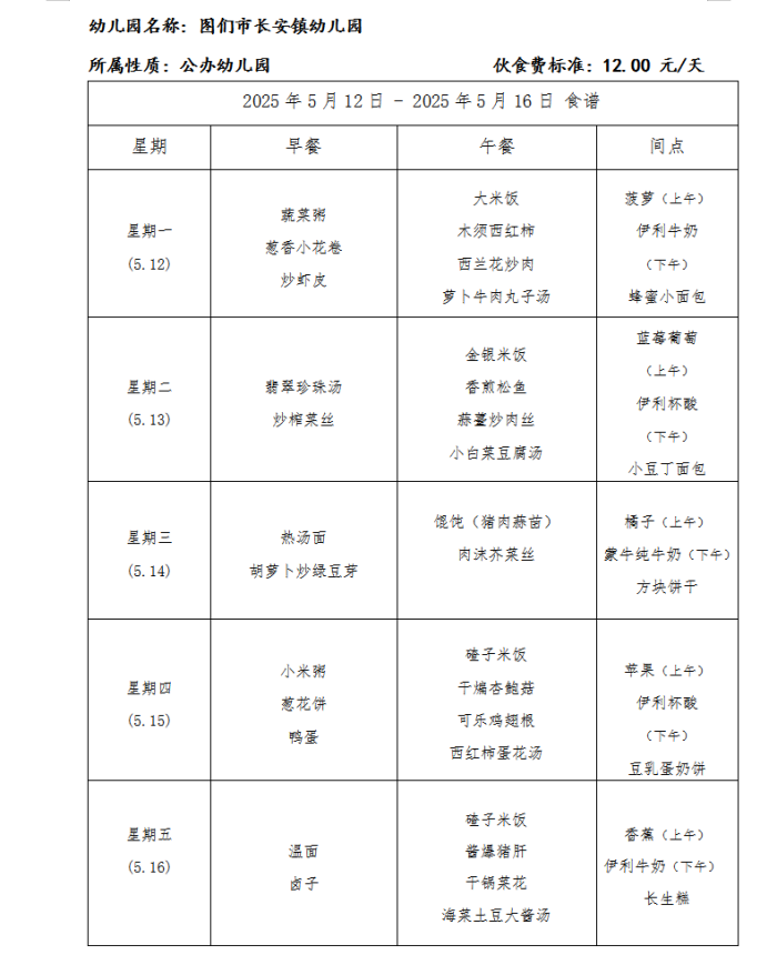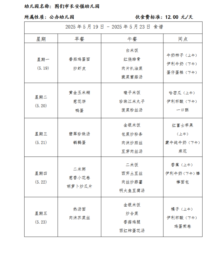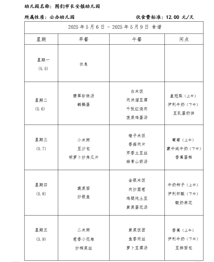 图们市长安镇幼儿园食谱(2025年5月)