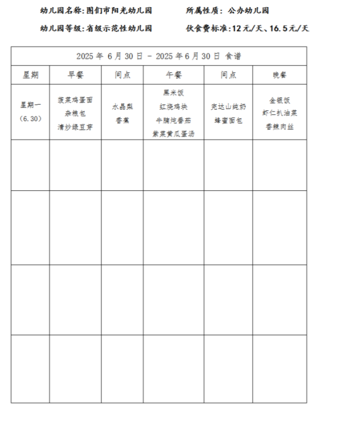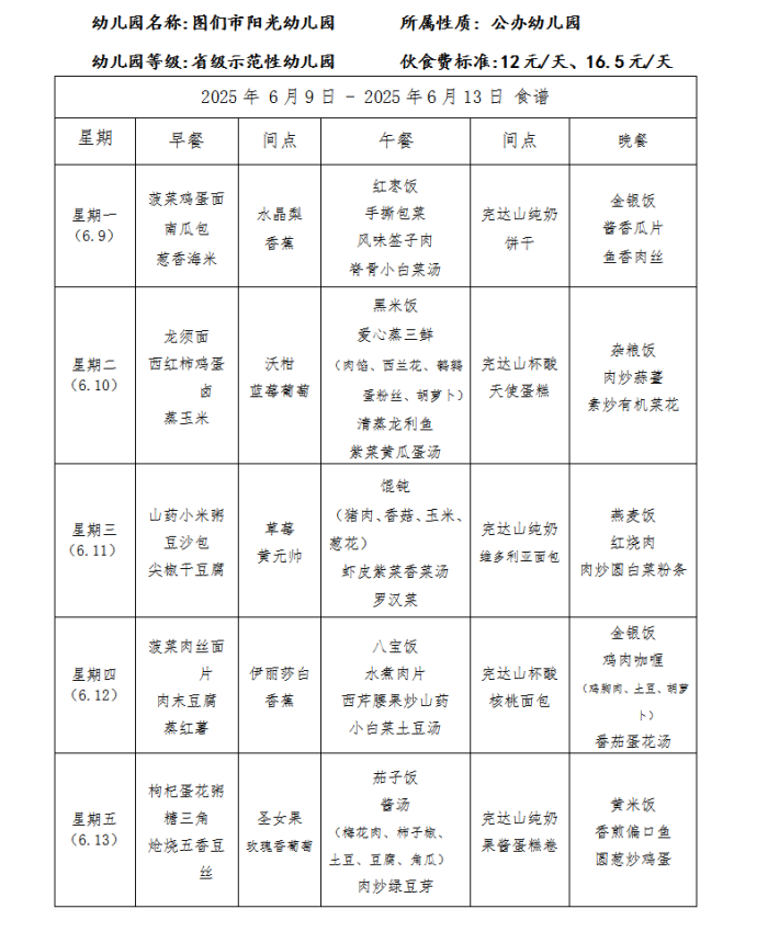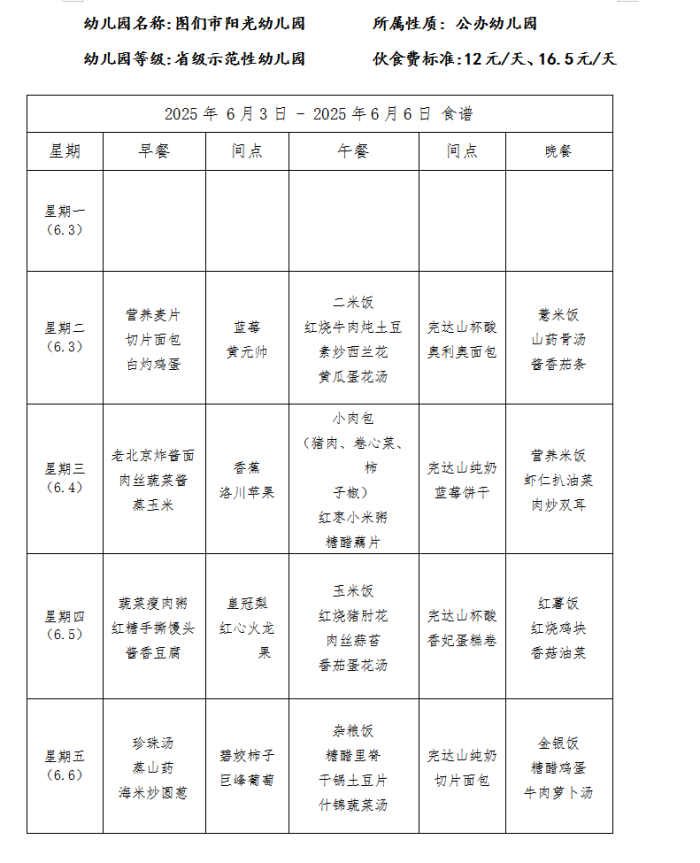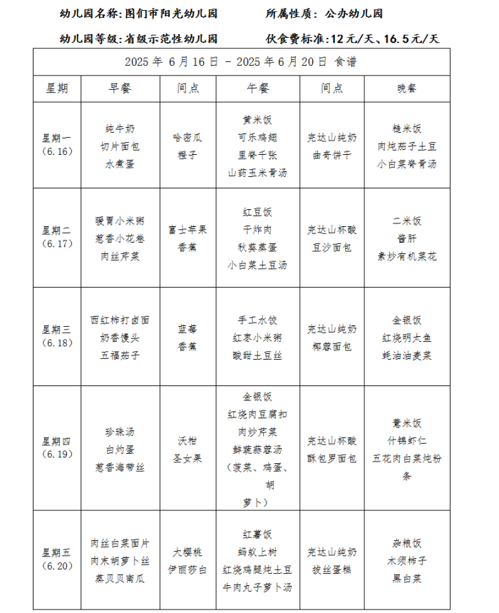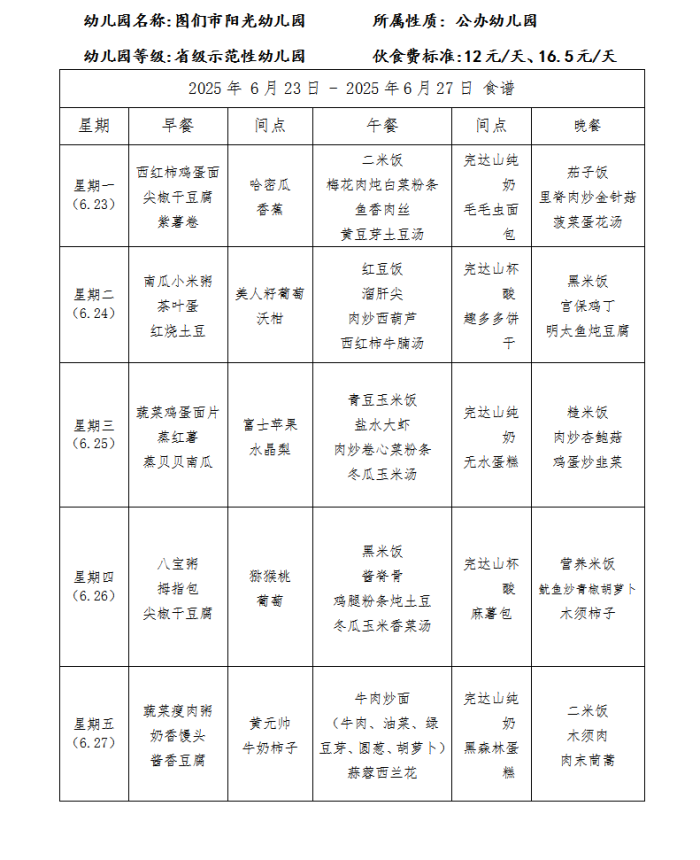 图们市阳光幼儿园食谱(2025年6月)