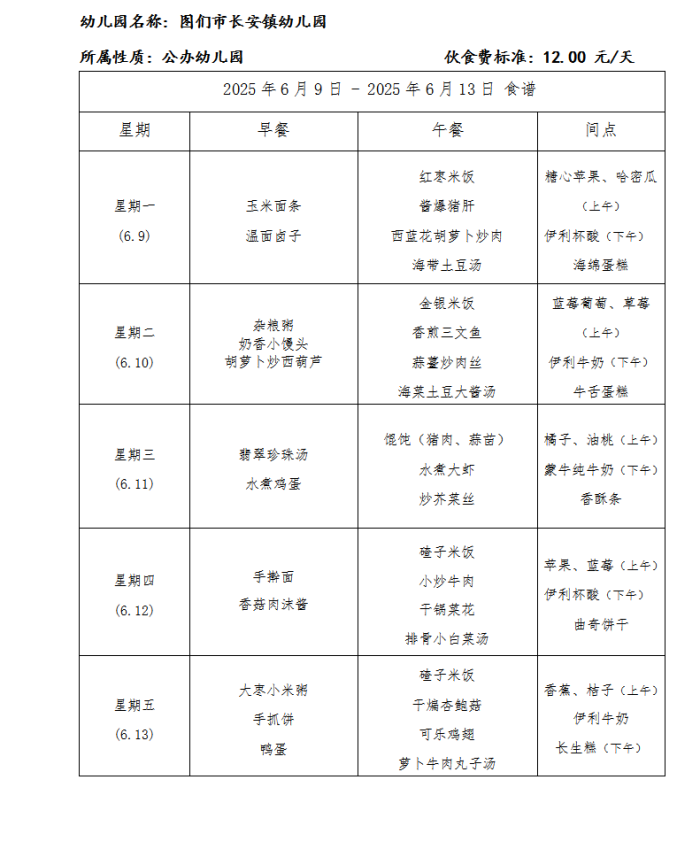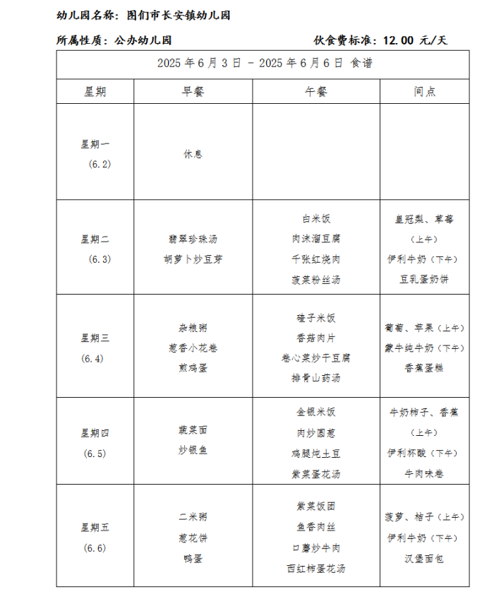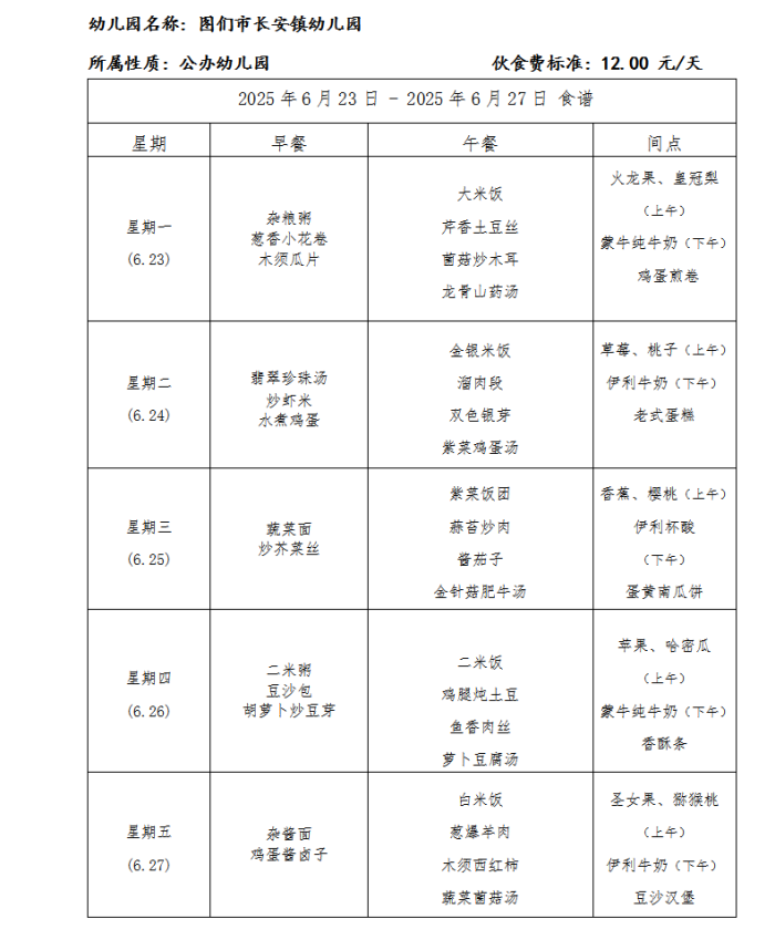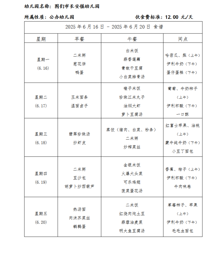 图们市长安镇幼儿园食谱(2025年6月)