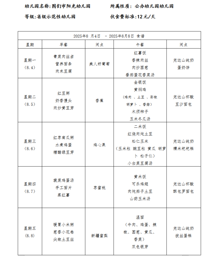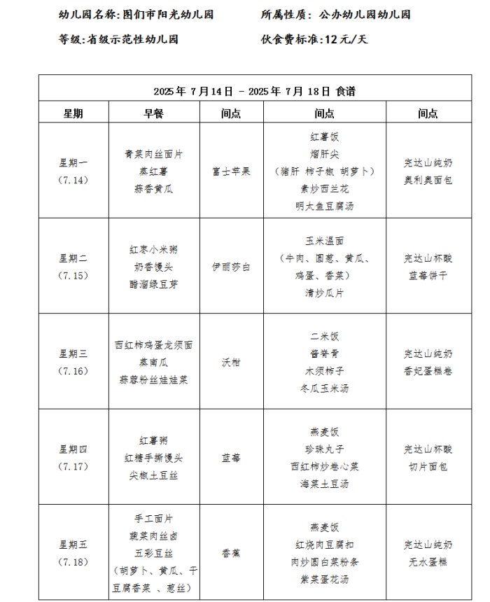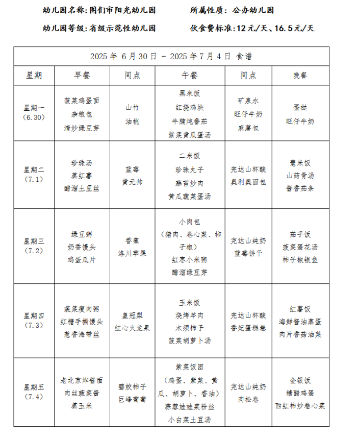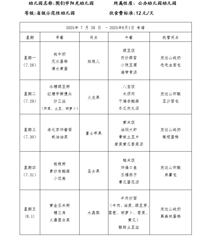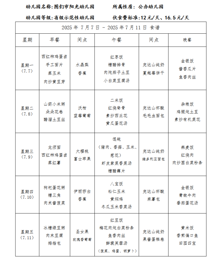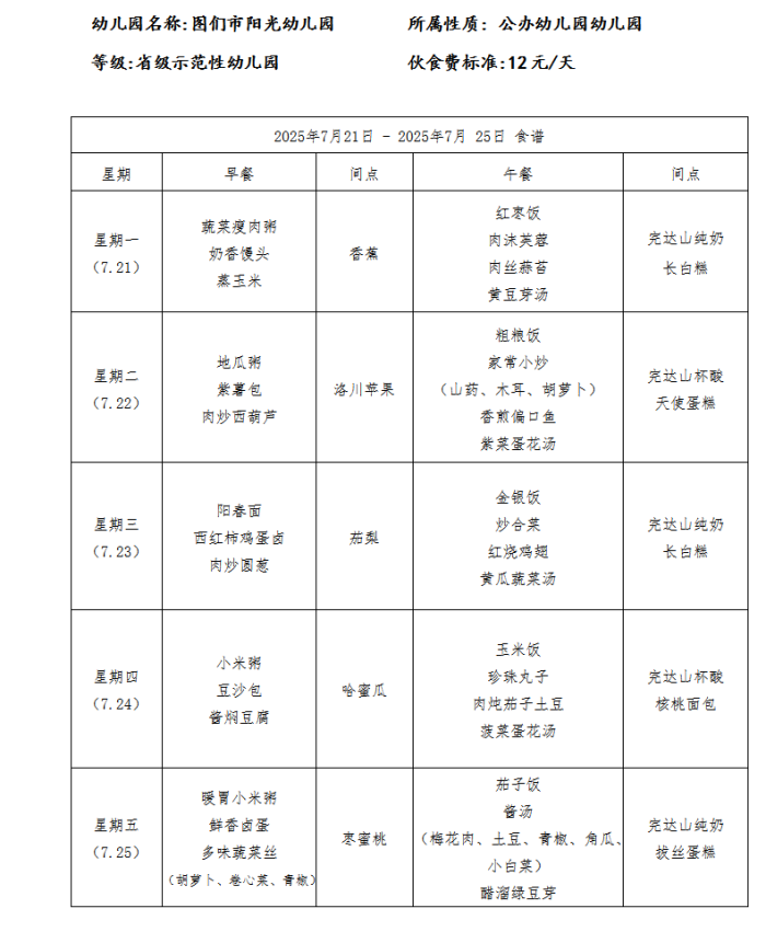 图们市阳光幼儿园食谱(2025年7月—8月)