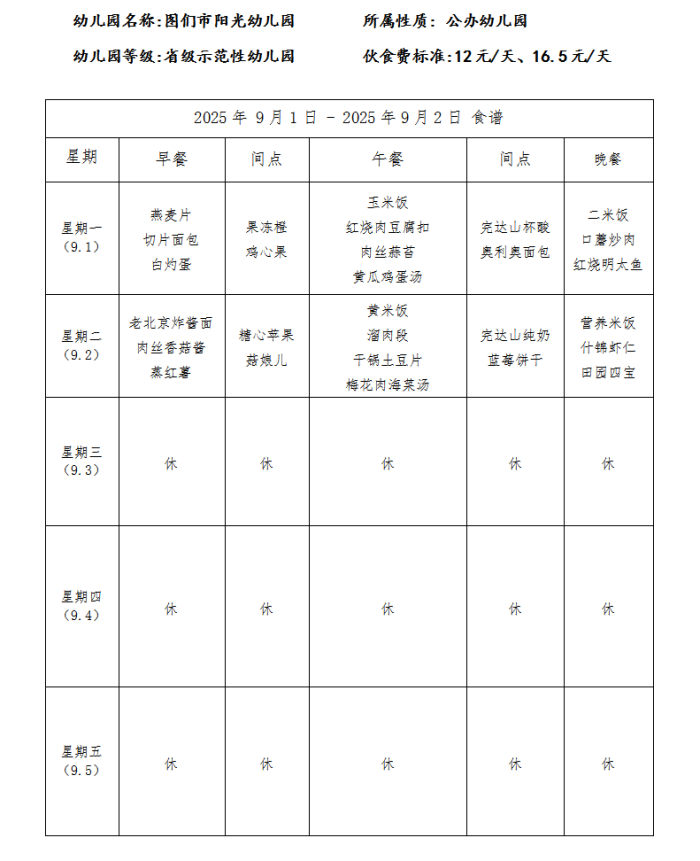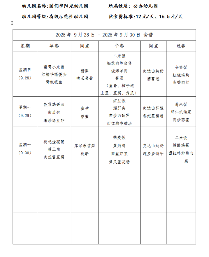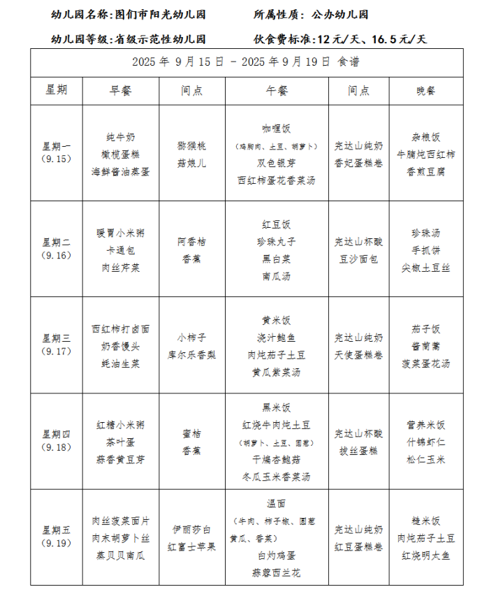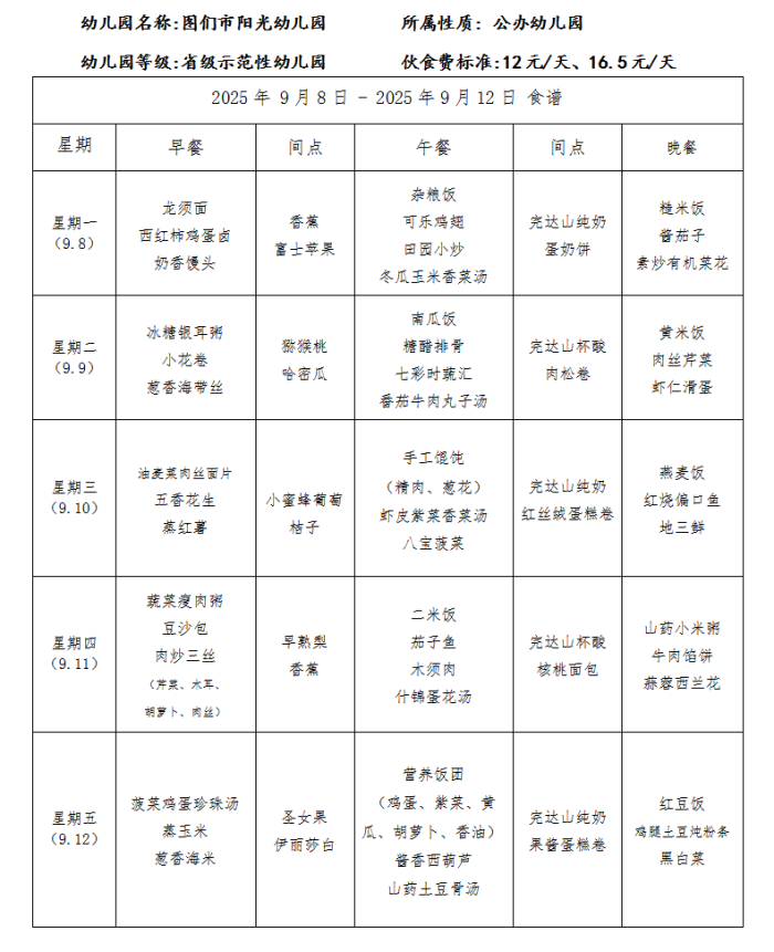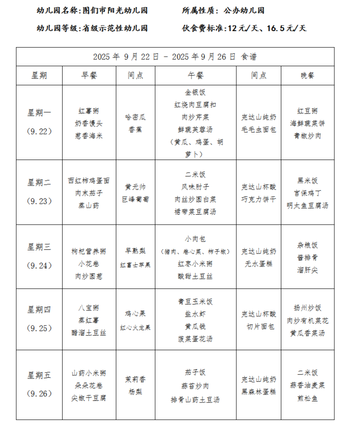 图们市阳光幼儿园食谱(2025年9月)